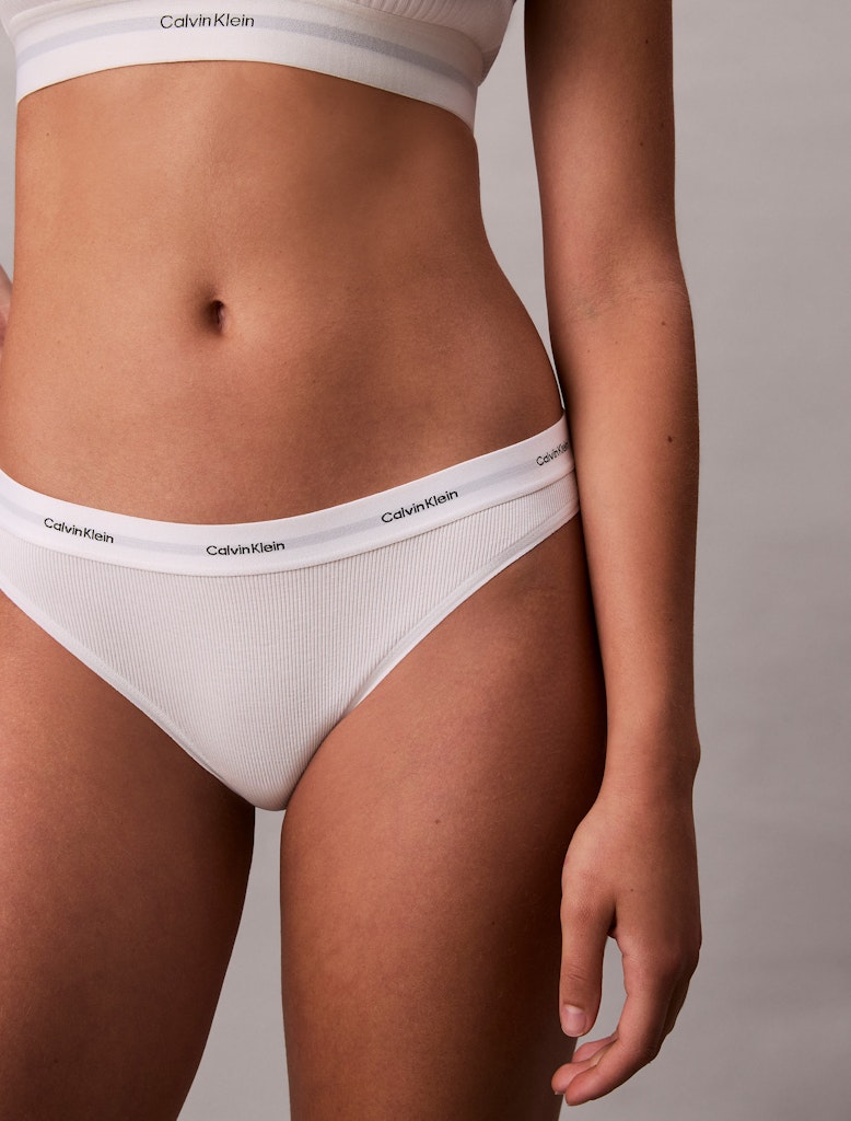 Calvin Klein bikini malliset alushousut, joissa logo-kuminauha. Ribattua kangasta.