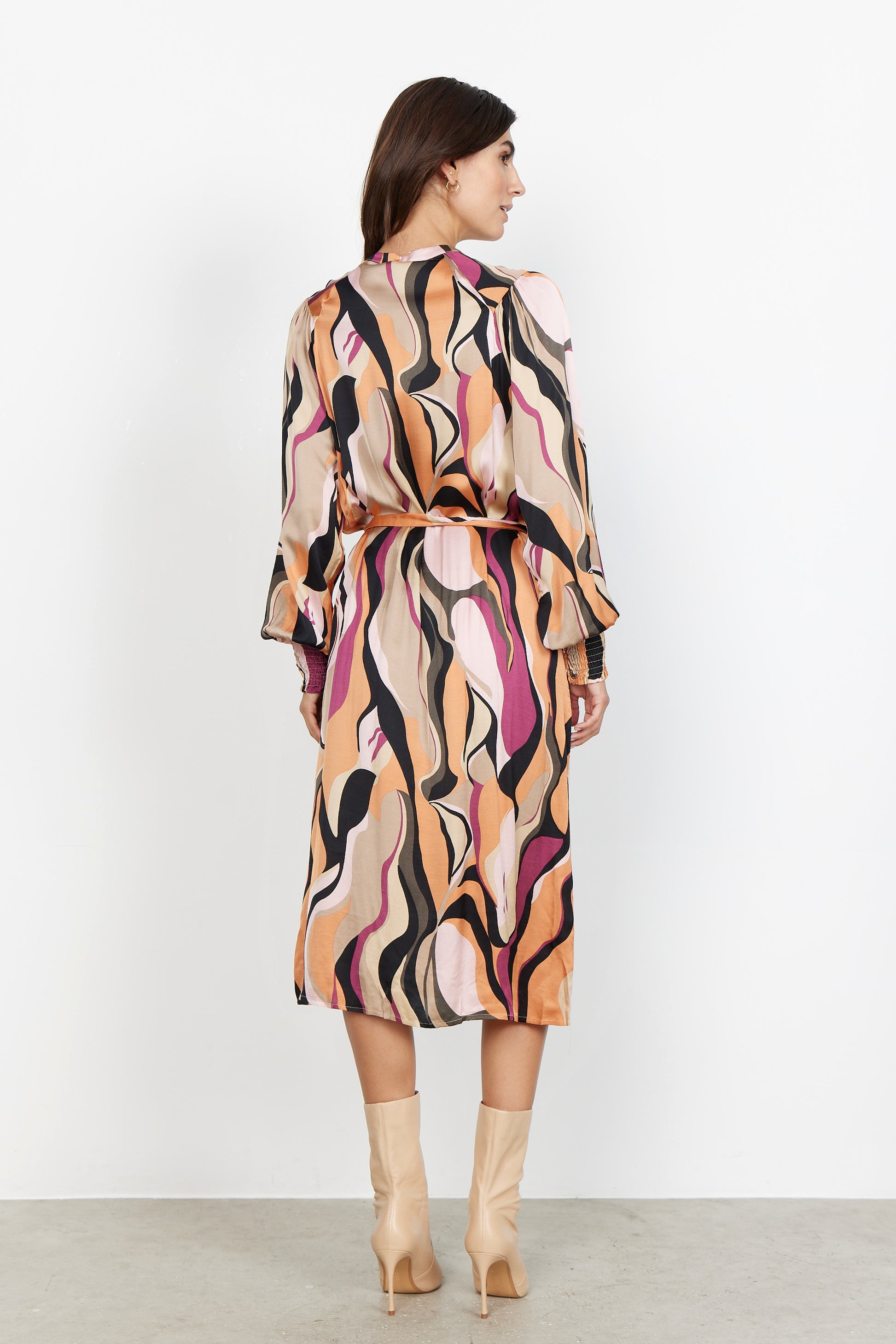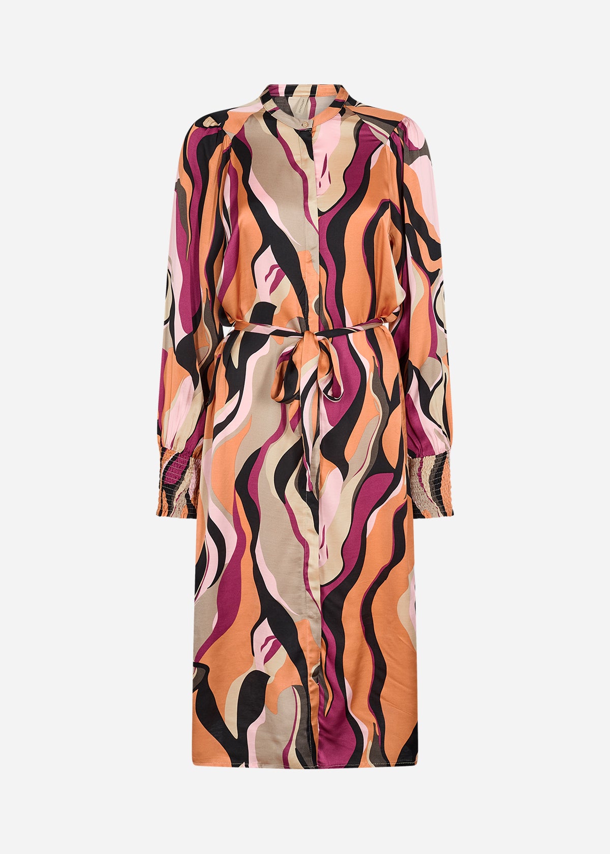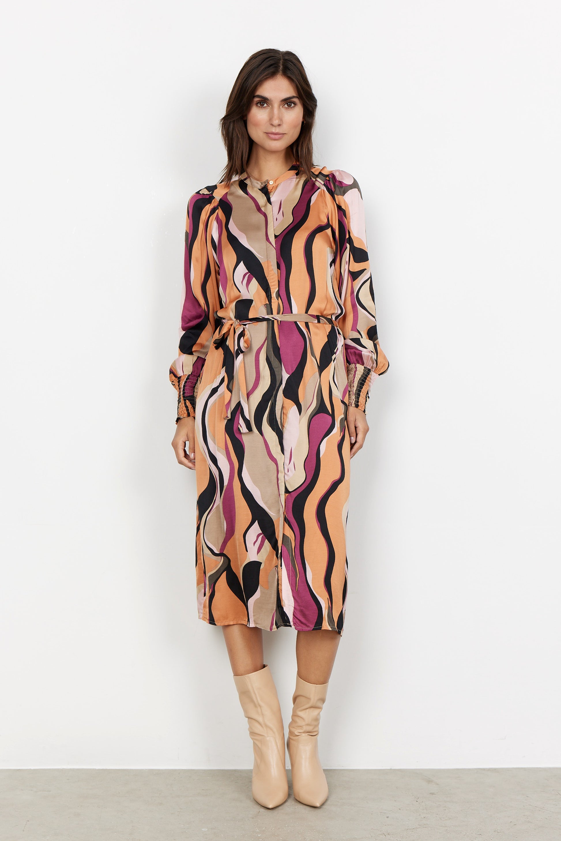 Soyaconceptin kauniisti laskeutuva mekko. Edessä napit ylhäältä alas saakka ja hihansuissa rypytetyt resorit. Mukana tulevalla vyöllä saat säädeltyä mekon istuvuutta.