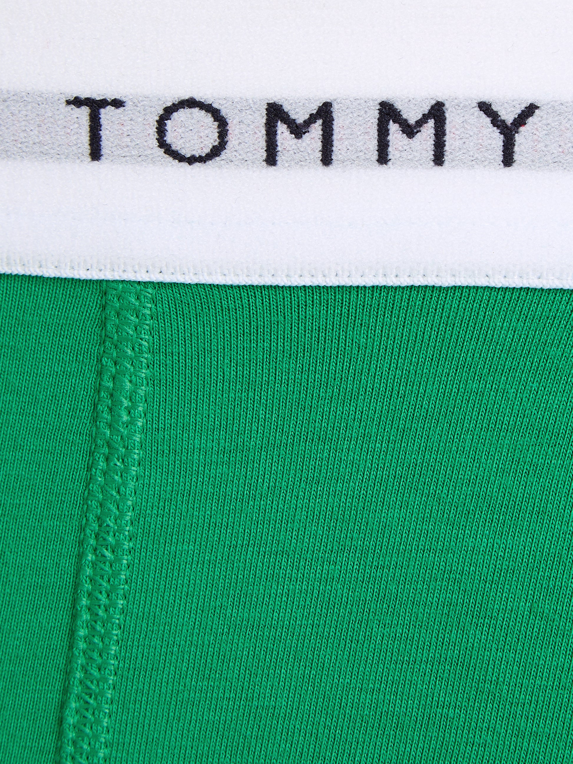 Tommy Hilfigerin kolmen paketti puuvillaboksereita. Logo-kuminauha vyötäröllä. Paketissa vihreät, tummansiniset ja keltaiset bokserit.
