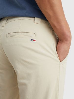 Tommy Jeansin chinoshortsit, joissa on sivuilla taskut. Shortsien vyötäröllä on lenkit vyötä varten, edessä nappi sekä vetoketju kiinnitys