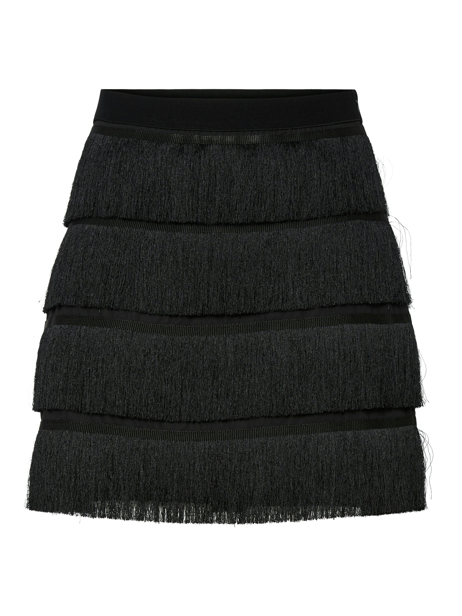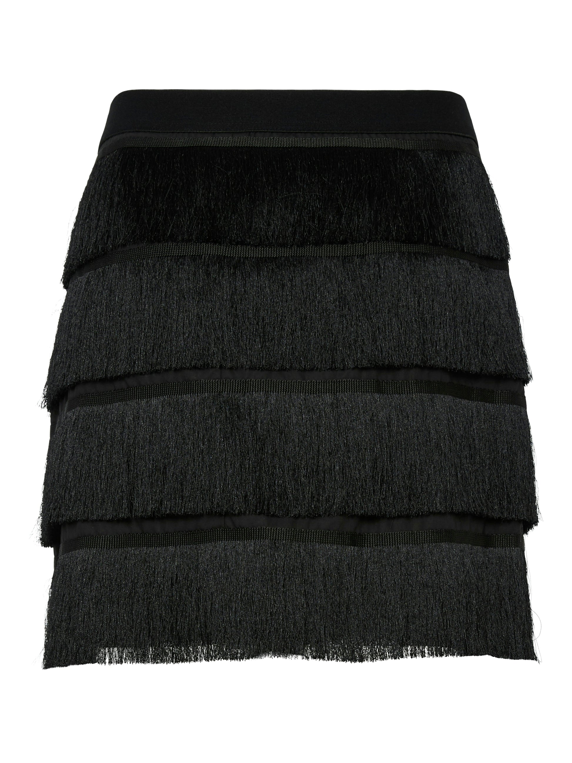 YAS:n näyttävä musta minihame kerrostetuilla hapsuilla. Joustava vyötärö takaa mukavan istuvuuden.