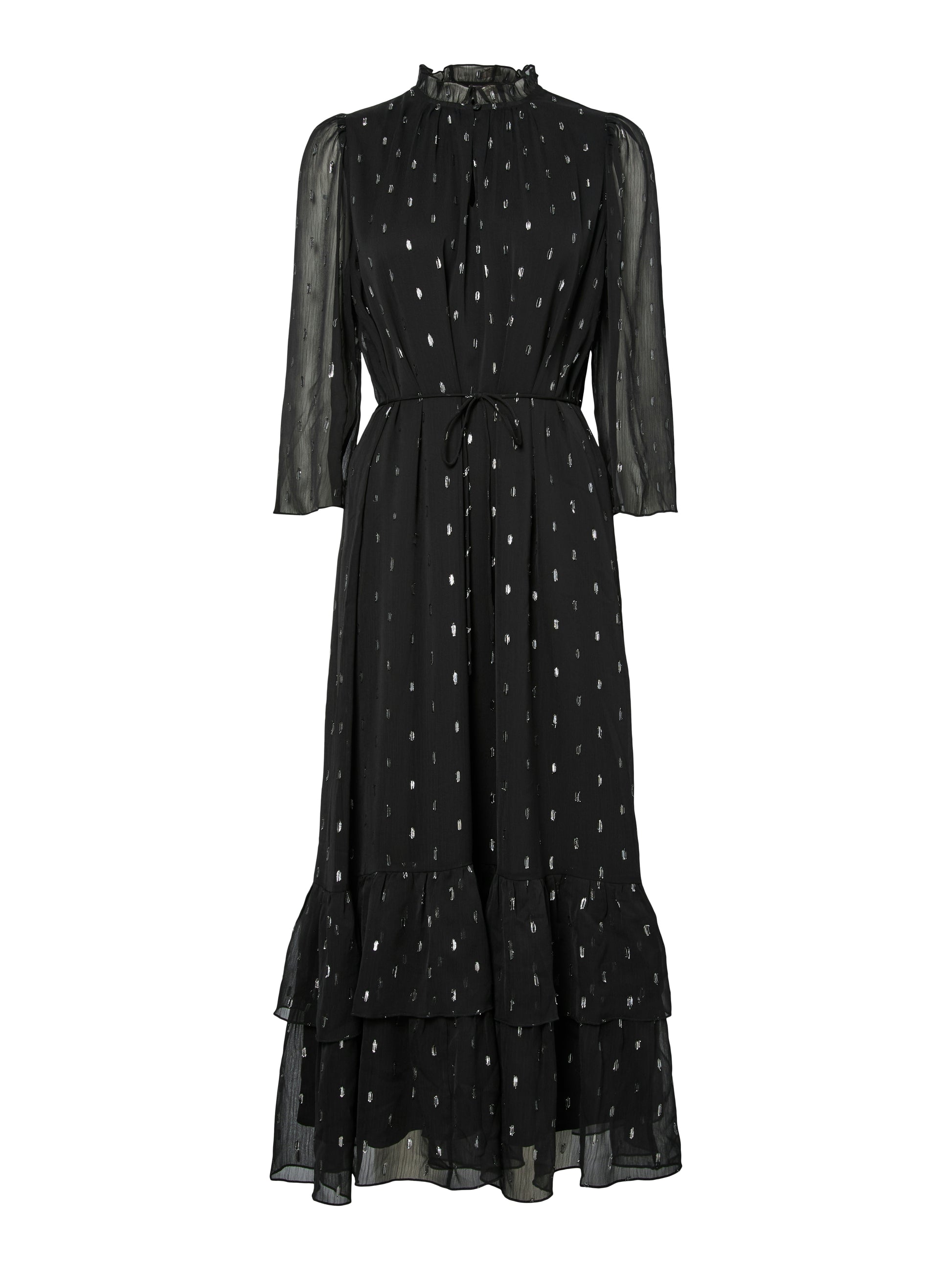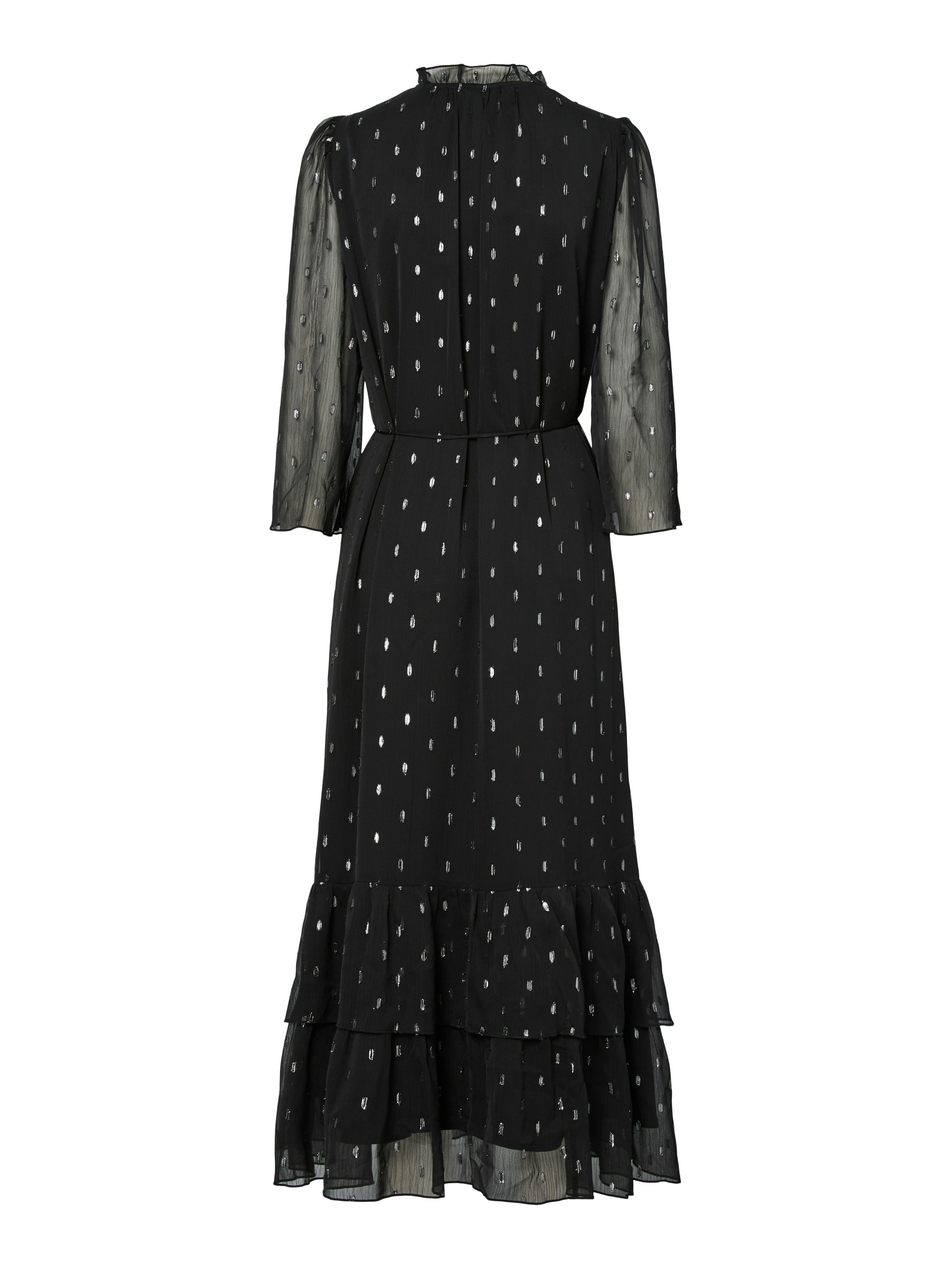 YAS:n ilmava mekko, jossa metallinhohtoisia pilkkuja. Mekossa läpikuultavat hihat sekä röyhelöinen helma ja kaulus. Keskellä solmittava nauha.