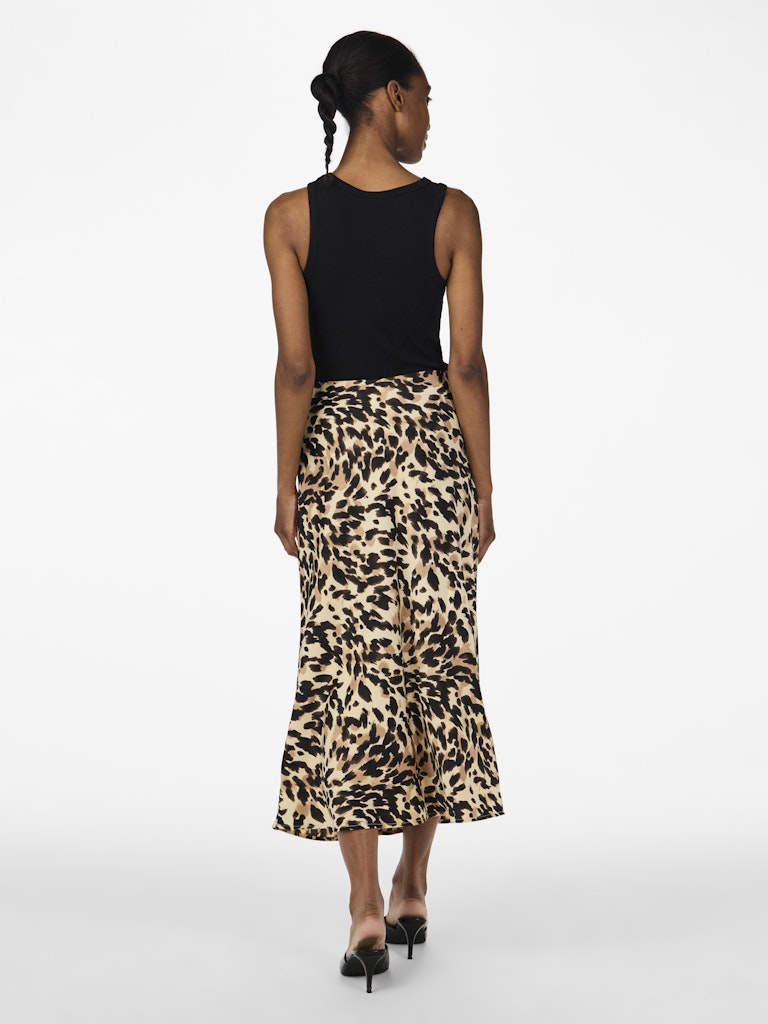 YAS:n kiiltäväpintainen midi-hame. Vyötäröllä kuminauha, jolloin hame on mukava pukea ylle ja se istuu vyötäröltä hyvin. Helma ulottuu polven alapuolelle.