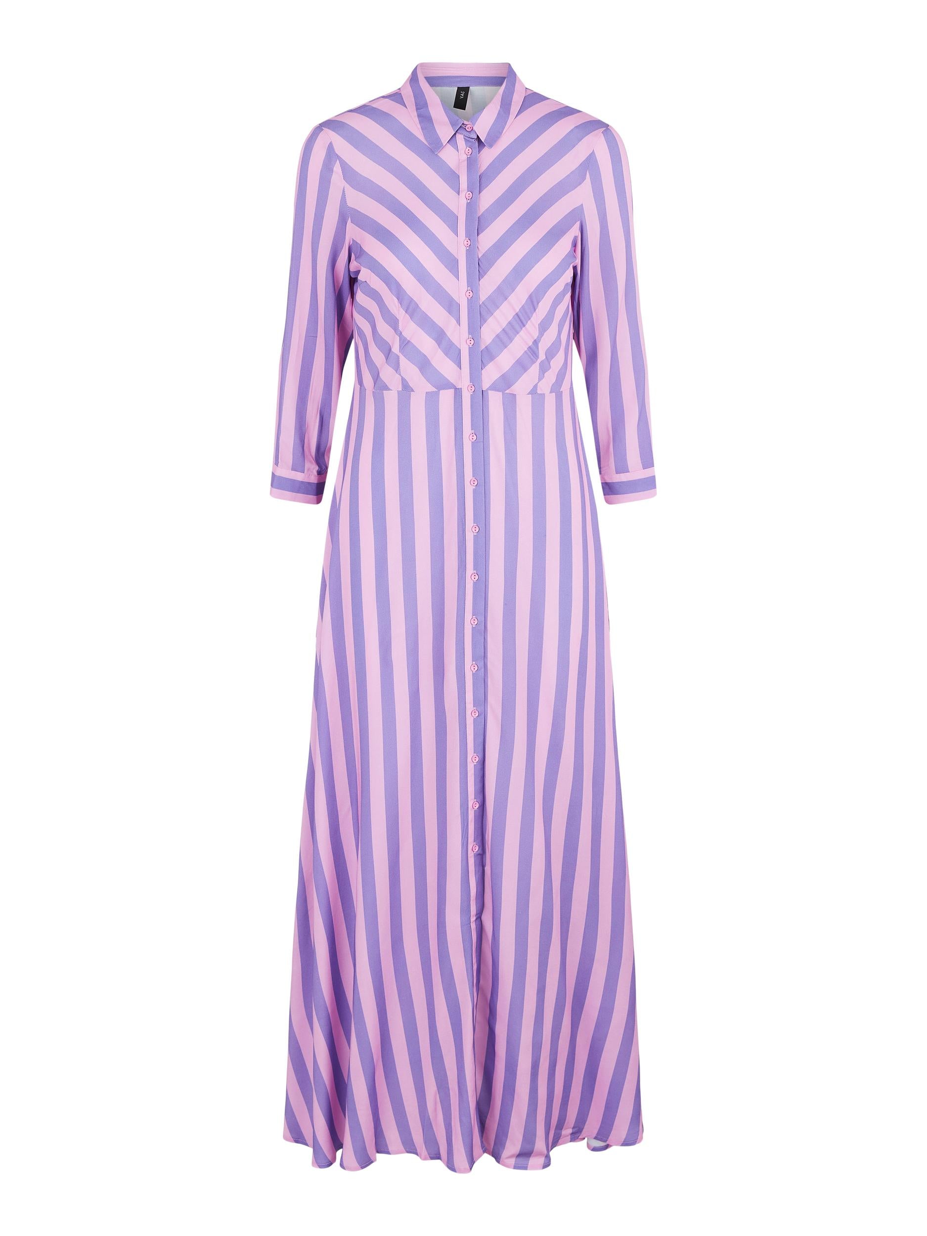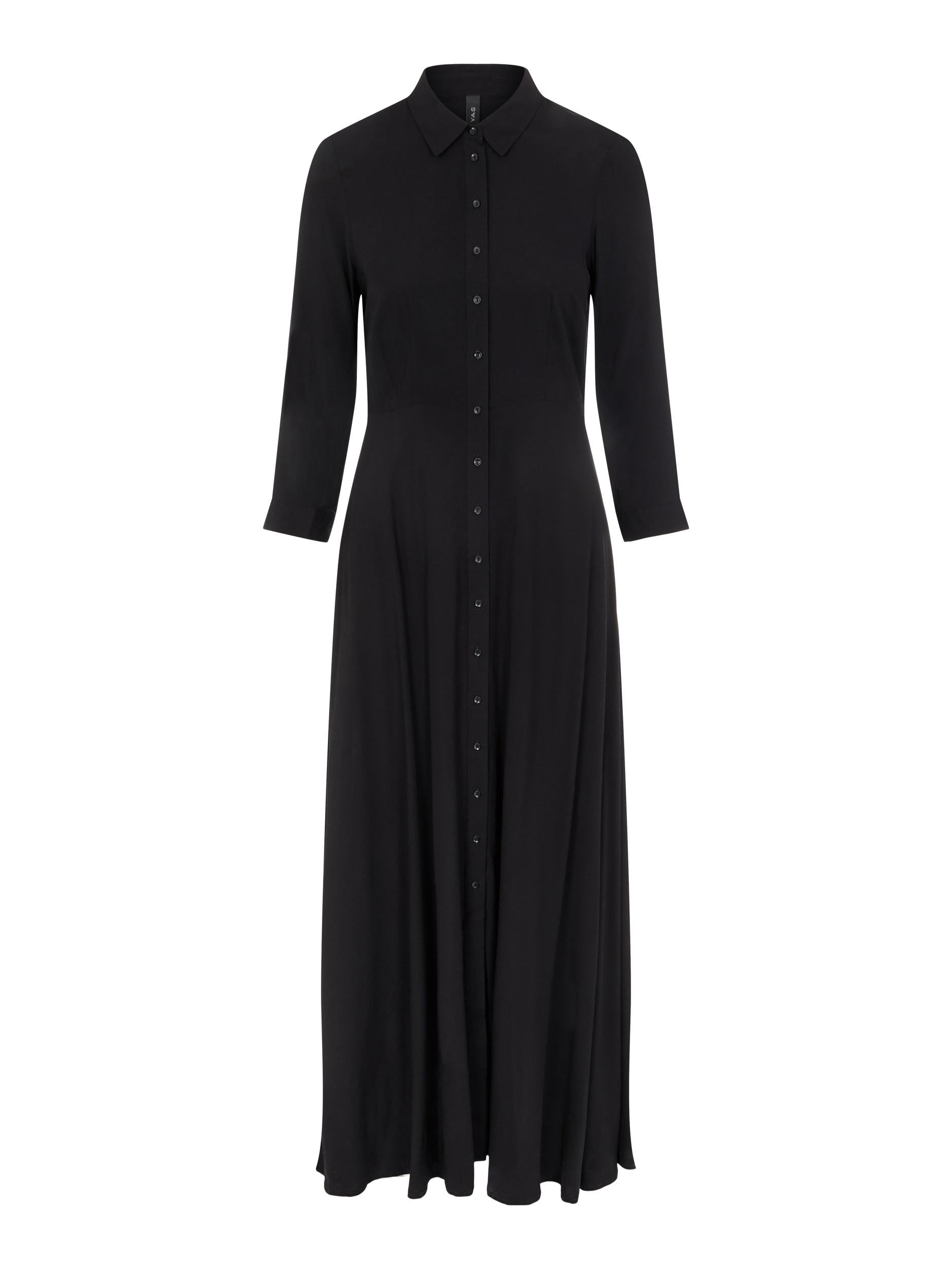 YAS :n maksimekko on vartalonmyötäinen malli, poikkileikkaus vyötäröllä ja leveämpi hameosa. Pieni kaulus ja täyspitkä napitus edessä. 3/4-pituiset hihat.