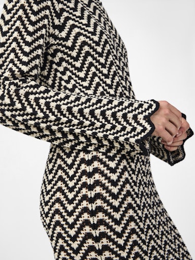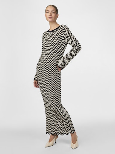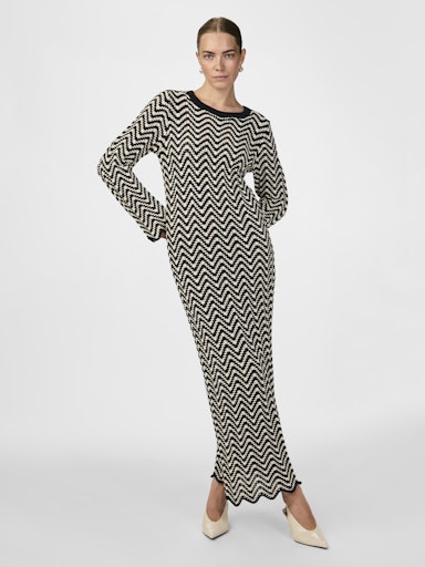 YAS:n tyylikäs, lämmin ja pitkä neulemekko, jossa mustavalkoinen kuviointi. Mekossa on pitkät hihat ja nilkkapituinen helma, mikä tekee siitä täydellisen viileämpiin päiviin. Rennon mutta elegantin leikkauksen ansiosta mekko sopii niin arkeen kuin juhlavampiin tilaisuuksiin.